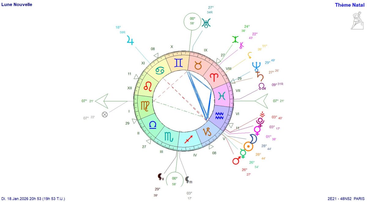 Depuis le 15 janvier, un climat constructif émerge donc, perceptible dans nos affaires. Or, ce dimanche soir 18 janvier, le Soleil et la Lune rejoignent les planètes du stellium pour former la Nouvelle Lune. Un climat exceptionnellement porteur se développe. Il promet, dans nos vies, un élan pour construire l’avenir qui débute dès ce soir, les jours suivants, voire pendant toute la lunaison de 28 jours !